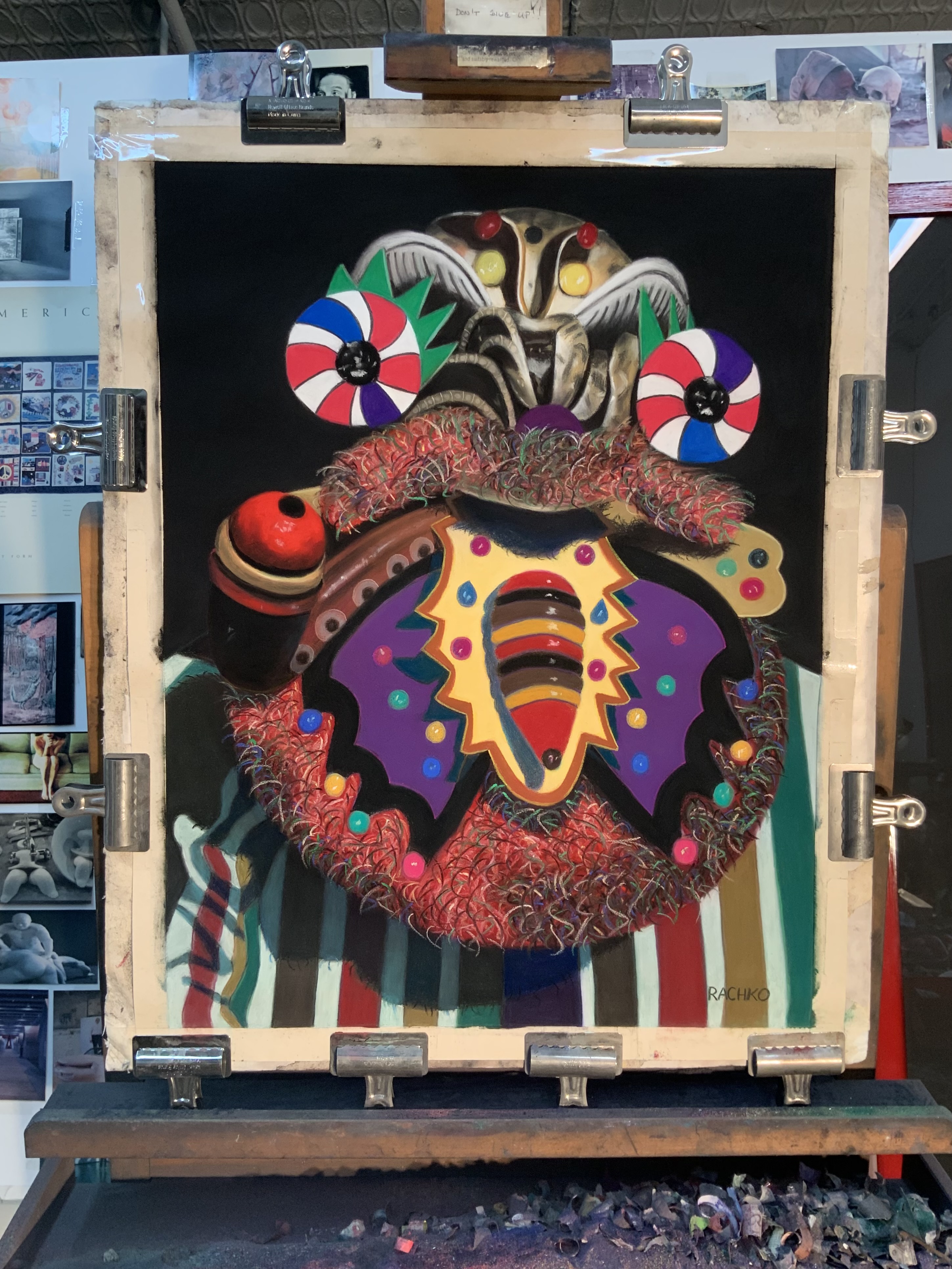The main impetus for Bolivianos was to continue work I began in the early 1990s. During a visit to La Paz, I captured a series of stunning photographs, inspiring me to translate them into a major pastel series. Each painting leads to ideas about the next, guiding the entire series’ evolution and shaping my understanding of its meaning. Both the series and my insights deepen as I engage further with the subject matter. The Bolivian Carnival masks I photographed provided the starting point for a long and continuing intellectual journey.