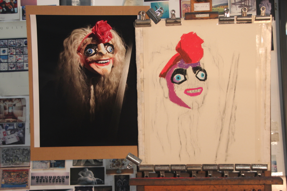 Start/Finish of “The Champ,” soft pastel on sandpaper, 26″ x 20″