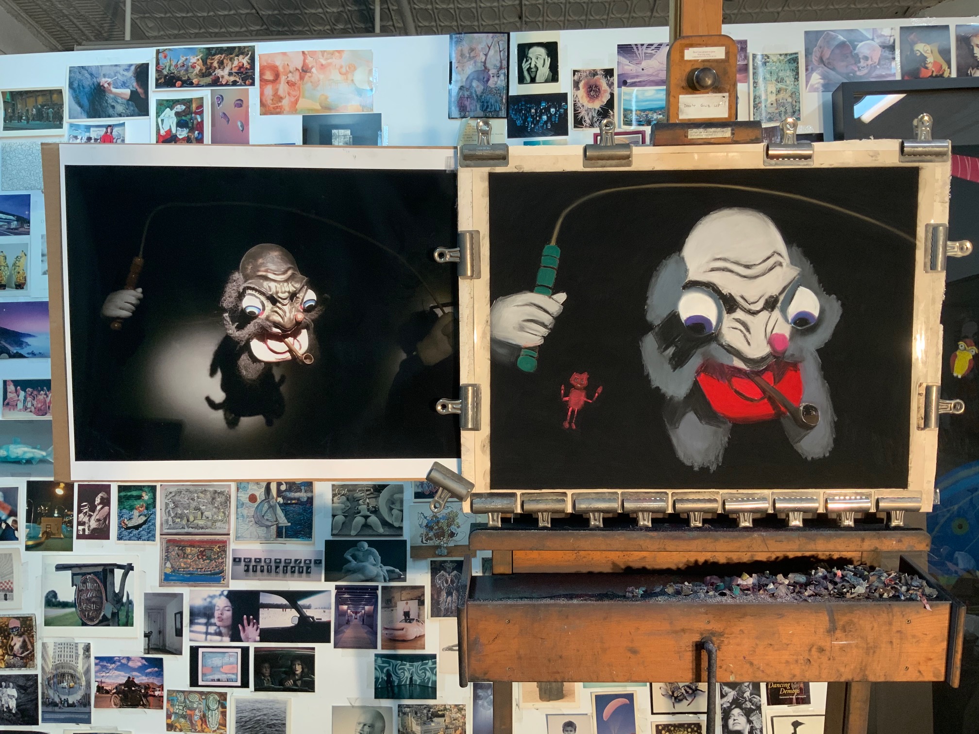 Start/Finish of “Majordomo,” soft pastel on sandpaper, 20” x 26”