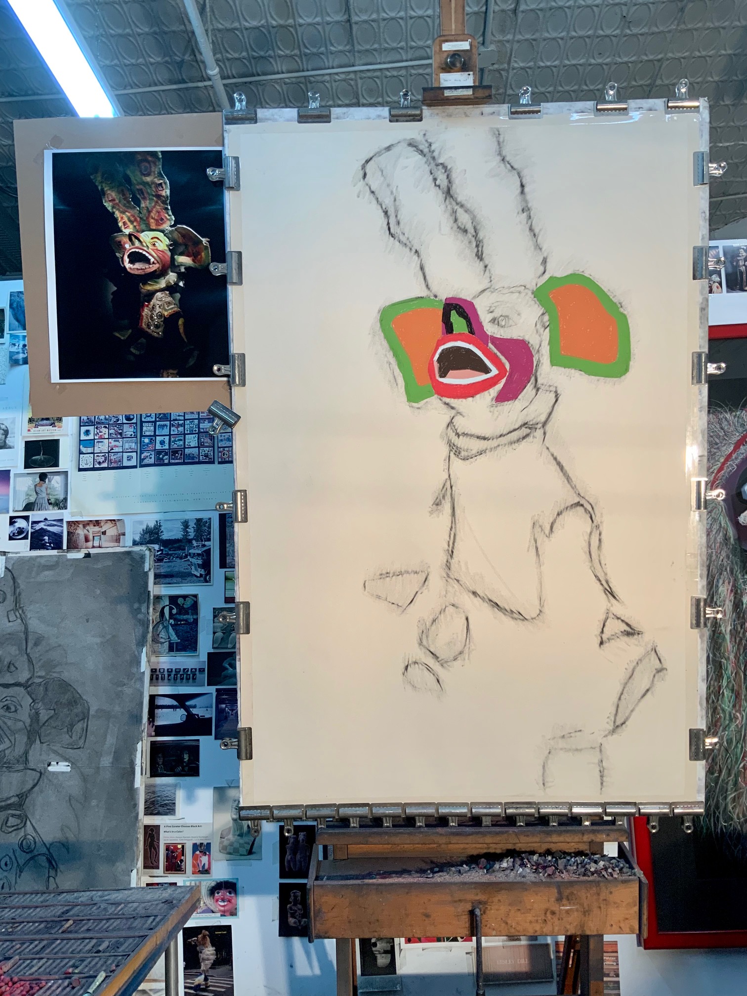 Start/Finish of ”Impresario,” soft pastel on sandpaper, 58” x 38” image, 70” x 50” framed