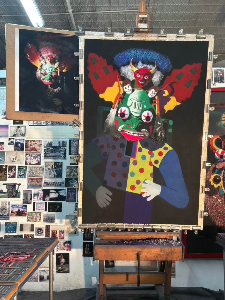 A: I continue working on “Gatecrasher,” soft pastel on sandpaper, 58” x 38.” In February I was privileged to visit this mask on exhibit at MUSEF La Paz in Bolivia. It was my second visit to the museum; the first was in 2017. Even more so this time, I was bowled over with how spectacular this particular mask is in person. Plus, I had forgotten its huge size. So I am absolutely determined to bump up my game and even more inspired to make this painting as strong and powerful as I possibly can!