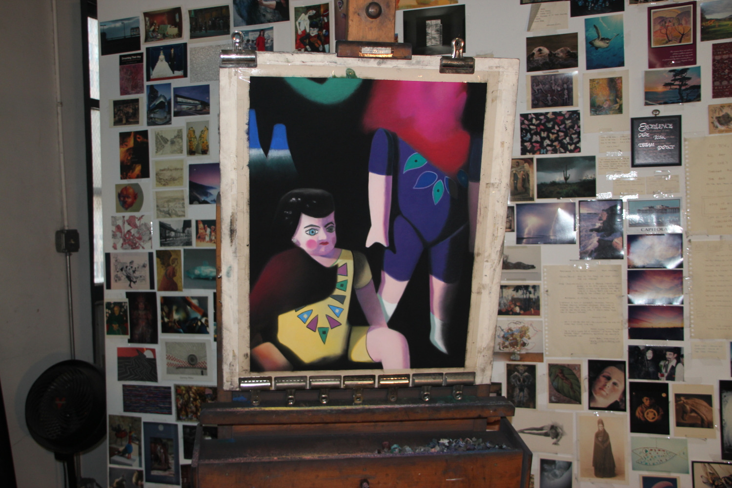 A: I’m putting finishing touches on a small one, “Absence,” which is 26″ x 20″ unframed. It depicts paper mache figures that I bought some years ago in Oaxaca and Mexico City. I added those two blue and white “volcano” shapes on the left after my recent trip to Bali. Check out the dust (and torn pastel wrappers) on the easel. That’s what inspired the name of my blog.