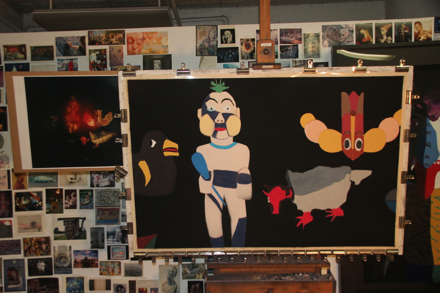 A: I am in the very early stages of a large pastel painting. I have never painted any of these figures before and they originated in different parts of the world. The bird (left) is from the Brooklyn Museum’s store, although it was hand carved in Guatemala. The standing figure is carved wood with beautiful painted details. It was a lucky find on a trip to Panajachel, Guatemala. The armadillo (red and grey) was made by one of my favorite Mexican folk artists (now deceased) and I believe it’s one of the last pieces he completed. It is a papier mâché figure that I found in a small shop in Mexico City. The figure on the upper right is a wooden mask bought from a talkative and talented artist at a hotel in Kandy, Sri Lanka. It depicts nagas (cobras), although you can’t tell that yet in the painting.