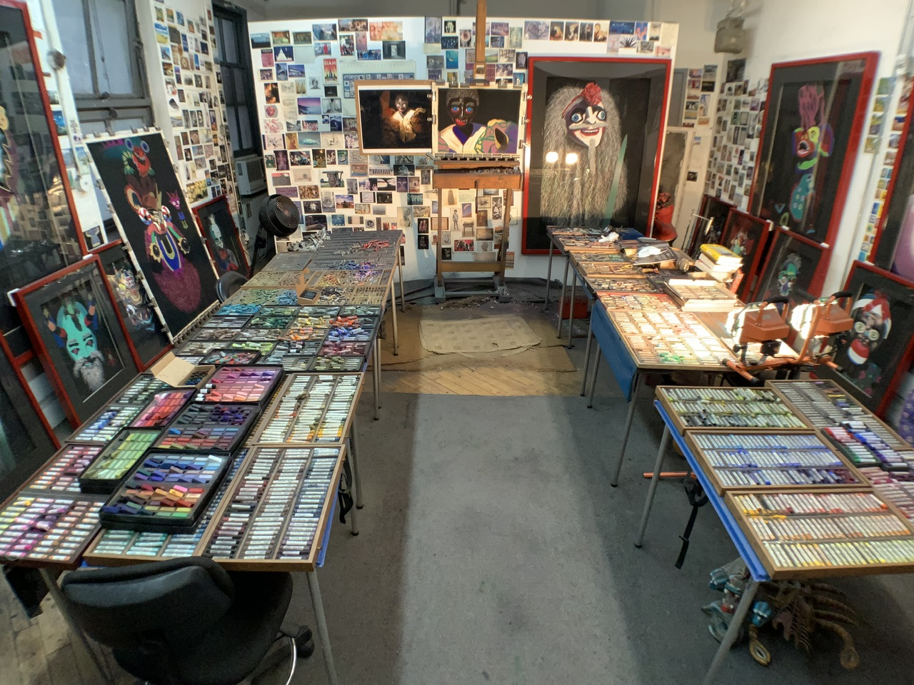 “Poseur,” soft pastel on sandpaper, 70” x 50” framed