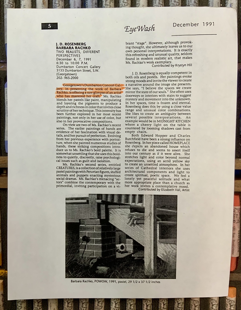 In December 1991 I presented a solo exhibition at Dumbarton Church in Georgetown (Washington, DC). For years Bryan had volunteered to set up chairs, a Steinway piano, and other miscellaneous equipment for their classical music concert series. The church’s downstairs space was used to showcase artists’ work. So I applied for a solo exhibition, was accepted, and got my first review in a local Washington, DC newspaper called “Eye Wash!”