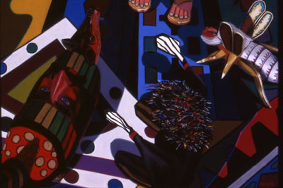 A: As I continue to evolve my studio practice, I study and learn from various artists, living and long gone, who have mastered visual art and many other disciplines. I cannot point to any particular artists that directly influenced “Incognito” or any other specific paintings.