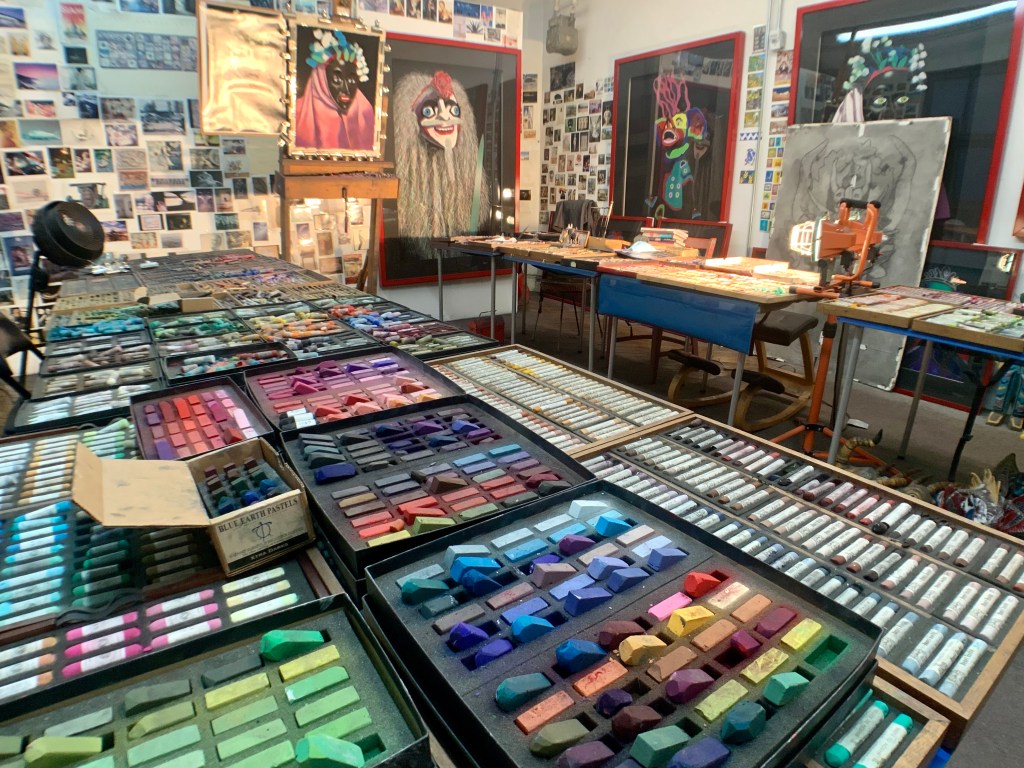 A: When people ask if I have a favorite pastel among the thousands in my studio, I am quick to answer, “Rembrandt black pastel!” This is the single color that I use the most. I buy them by the dozens because it takes many layers of pigment – applied and hand-blended together, one on top of the other, on sandpaper – to achieve the intense black backgrounds that distinguish my “Bolivianos” series of pastel paintings. Typically, I use up a minimum of two or three Rembrandt pastels to create these backgrounds. A few years ago one New York art critic cleverly dubbed them, “Barbara’s black-grounds.” How cool is that!