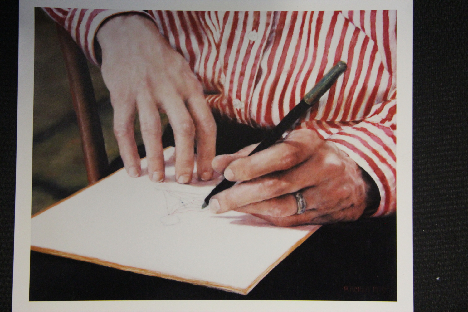 In 1990 Bryan was working on his Ph.D. in economics at the University of Maryland. In this painting he is drawing a diagram that illustrates a theoretical point about “international public goods,” the subject of his research. He was sitting in an old wooden rocking chair in our backyard in Alexandria, VA. I still own the chair and the house. I photographed his hands close-up and then created the painting. I don’t remember which of Bryan’s cameras I used, but it was one that took 35 mm film; perhaps his Nikon F-2. Somewhere I must still have the negative and the original reference photo.