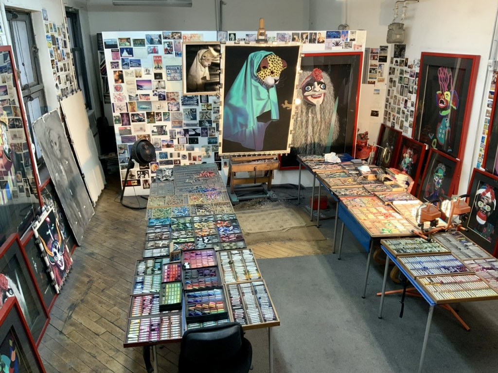 A: The arrangement of my pastels evolved organically. I keep them in their original trays. My oldest pastel sets are closer to the easel and the newest ones are the furthest away. After 37 years of experience working in pastel, I am well-acquainted with their individual properties. I know exactly where to find each color based on which manufacturer makes it.
