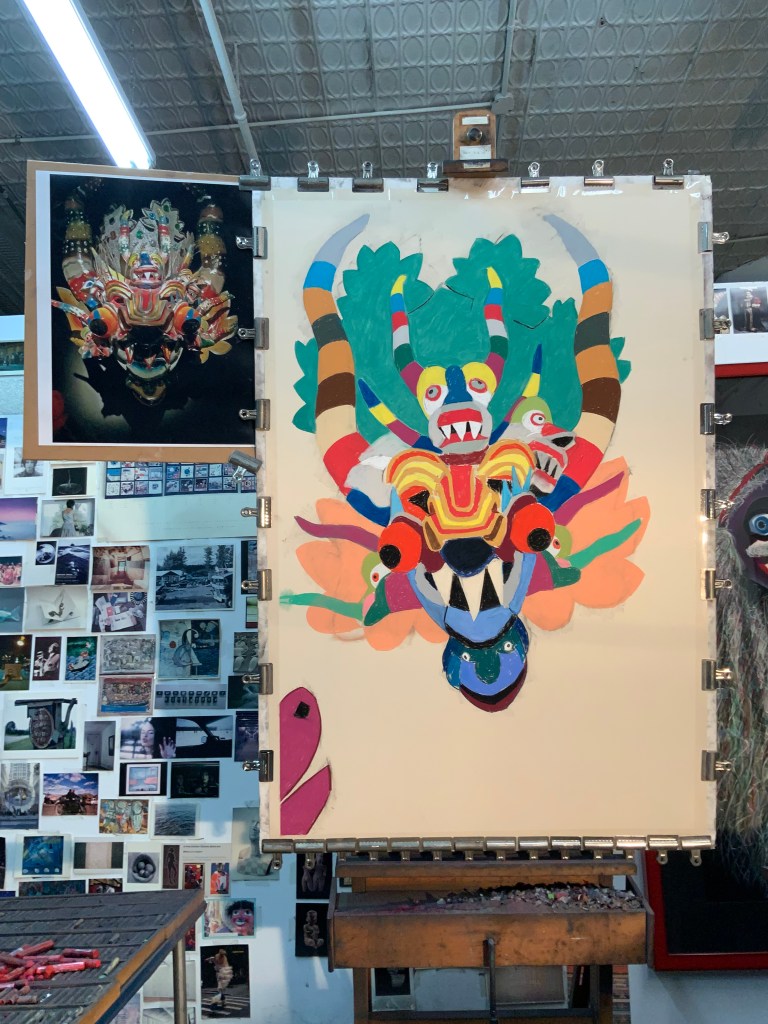 A: Mine is a slow and labor-intensive process. First, there is foreign travel to find the cultural objects – masks, carved wooden animals, paper mâché figures, and toys – that are my subject matter. If they are heavy I ship them home.