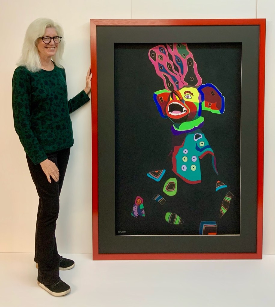 With “Impresario,” 70” x 50” framed, soft pastel on sandpaper