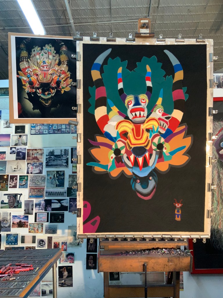 A: I am in the very early stages of a large pastel painting. I have never painted any of these figures before and they originated in different parts of the world. The bird (left) is from the Brooklyn Museum’s store, although it was hand carved in Guatemala. The standing figure is carved wood with beautiful painted details. It was a lucky find on a trip to Panajachel, Guatemala. The armadillo (red and grey) was made by one of my favorite Mexican folk artists (now deceased) and I believe it’s one of the last pieces he completed. It is a papier mâché figure that I found in a small shop in Mexico City. The figure on the upper right is a wooden mask bought from a talkative and talented artist at a hotel in Kandy, Sri Lanka. It depicts nagas (cobras), although you can’t tell that yet in the painting.