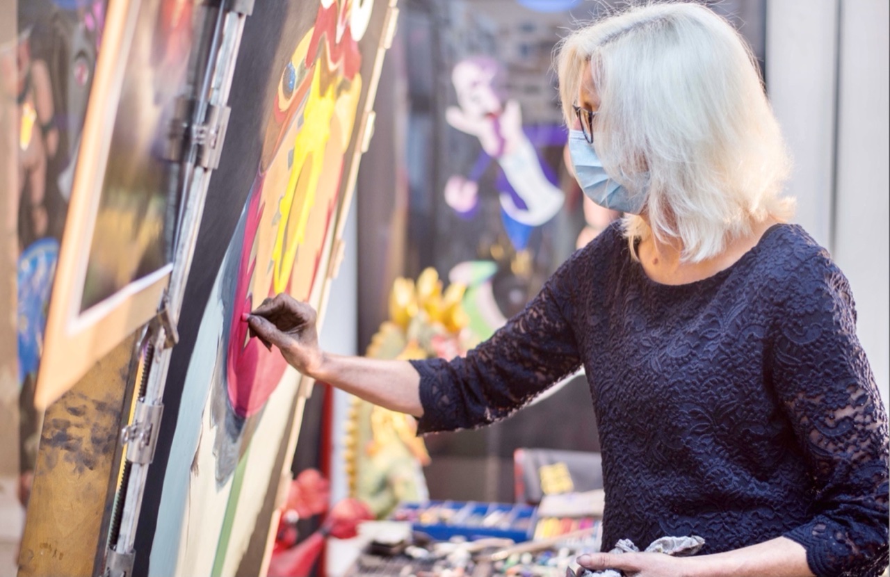 A: I wear a paper surgical mask – the type that has become ubiquitous since COVID – bought from a local medical supply store. I thoroughly coat my hands with barrier cream – Art Guard – to prevent pastel getting into my skin. The cream has an added benefit of making it easy to wash pastel off my hands. (Neither gloves nor individual finger cots ever worked for me. They made my fingers sweat and did not allow for the fine touch needed to blend new colors directly on sandpaper. Plus, they shredded from being rubbed against the paper’s grit). Also, it is very important that you work with your hand below your face so pastel dust falls below your nose, where you are less likely to breathe it in.